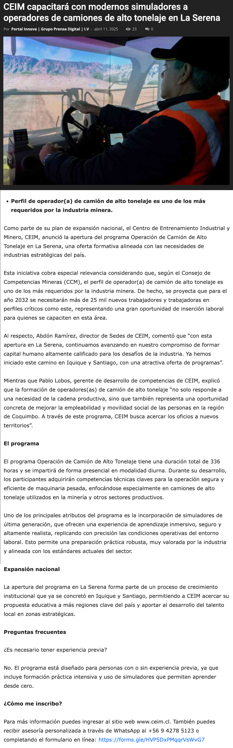 CEIM capacitará con modernos simuladores a operadores de camiones de alto tonelaje en La Serena - (calamaenlinea.cl)