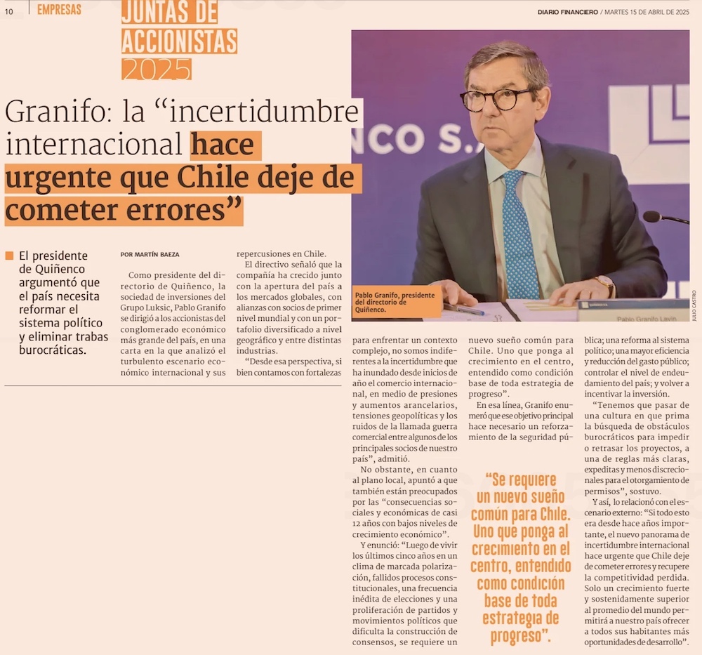 Quiñenco dice que es “urgente que Chile deje de cometer errores” - (El Mercurio de Santiago)