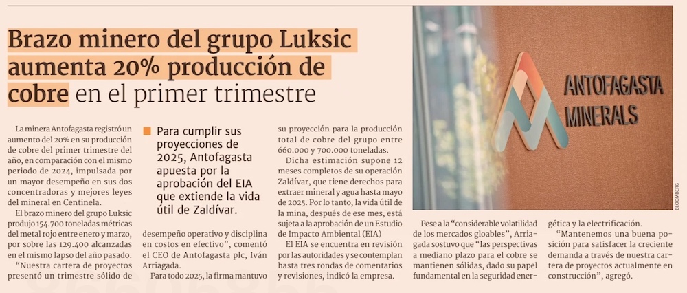 Antofagasta Minerals aumentó en 20% su producción en el primer trimestre - (El Mercurio de Calama)