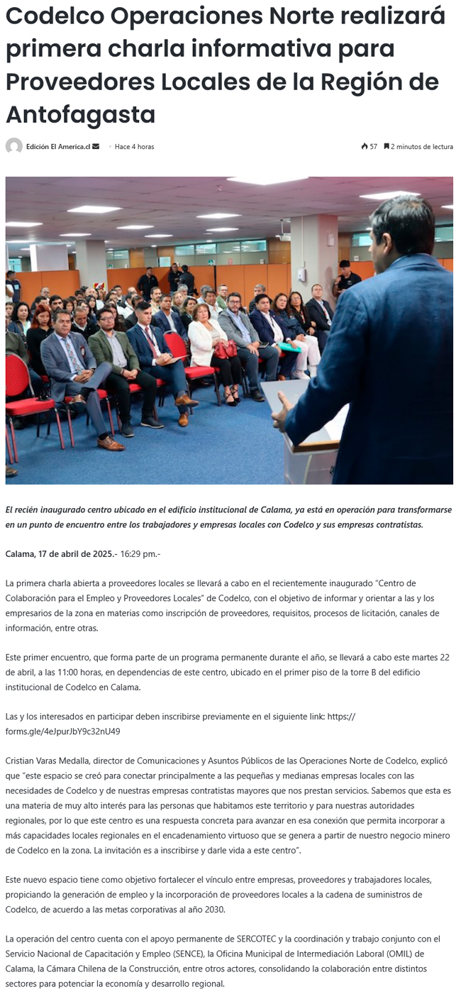 Centro para los Proveedores de Codelco tendrá su primer encuentro en Calama - (El Mercurio de Antofagasta)