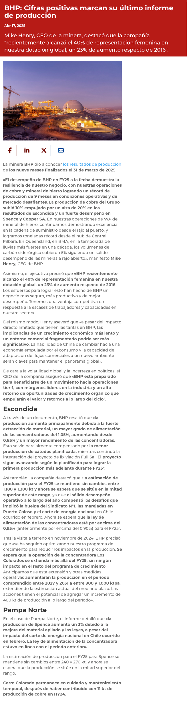 Escondida extiende sus buenos resultados con 20% de alza productiva - (El Mercurio de Antofagasta)