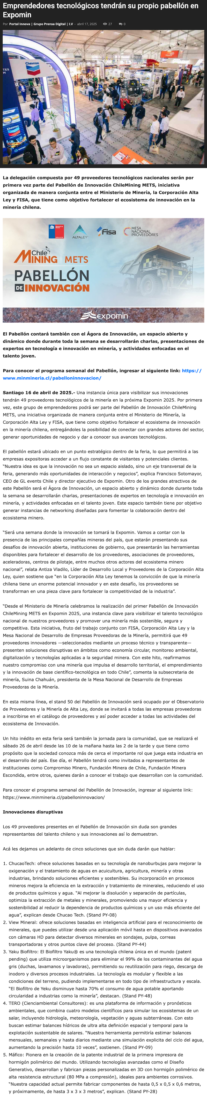 Expomin 2025: 49 Proveedores Chilenos de Tecnología Minera Debutarán en el Innovador Pabellón ChileMining METS - (redimin)