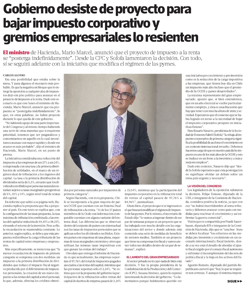 Gobierno abandona la reforma tributaria y CPC lamenta el freno a la rebaja del impuesto a las empresas - (El Mercurio de Santiago)