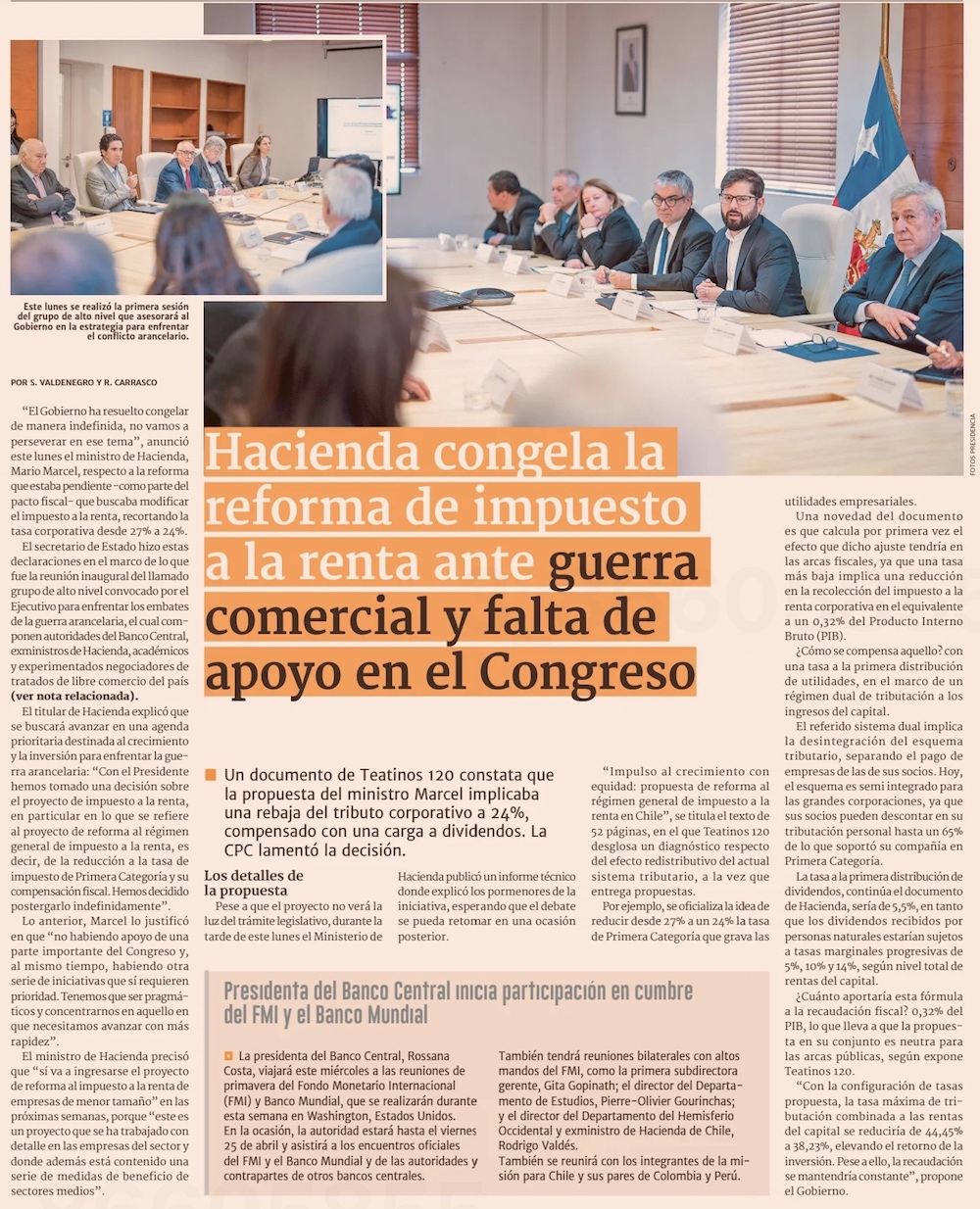 Gobierno abandona la reforma tributaria y CPC lamenta el freno a la rebaja del impuesto a las empresas - (El Mercurio de Santiago)