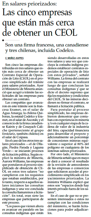 Eramet, Quiborax y Codelco avanzan en la obtención del CEOL para explotar litio en Ascotán - (El Mercurio de Antofagasta)