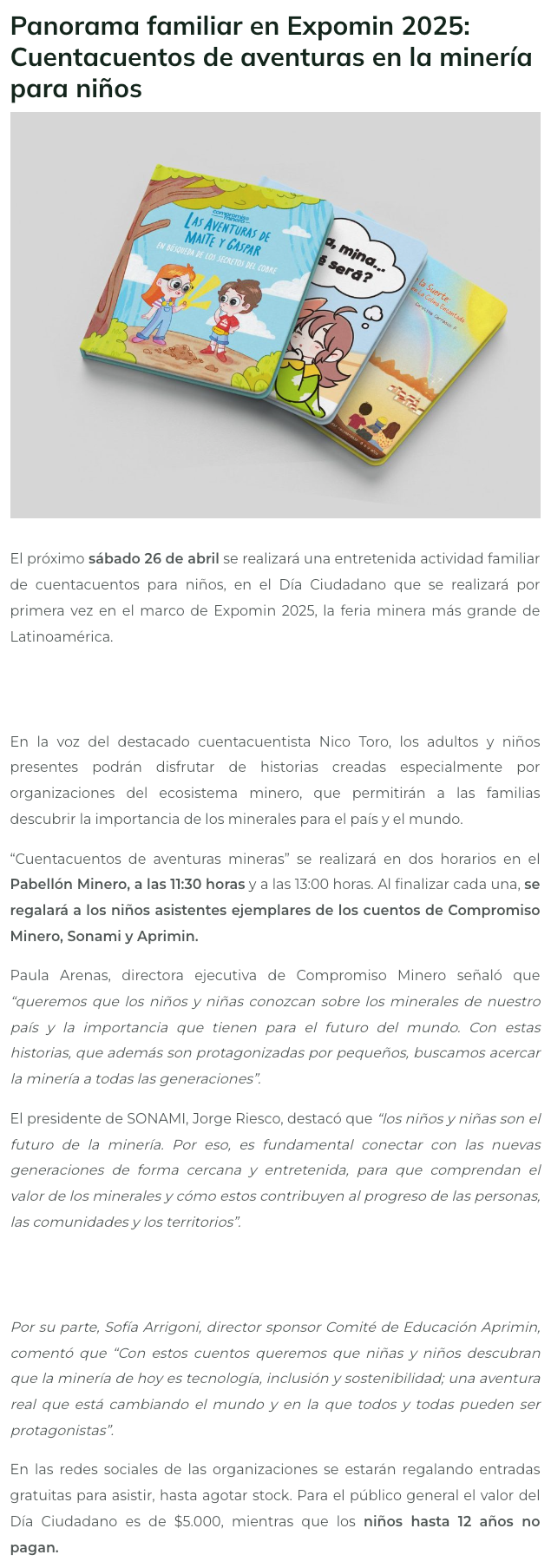 Panorama familiar en Expomin 2025: Cuentacuentos de aventuras en la minería para niños - (tecnautas.cl)