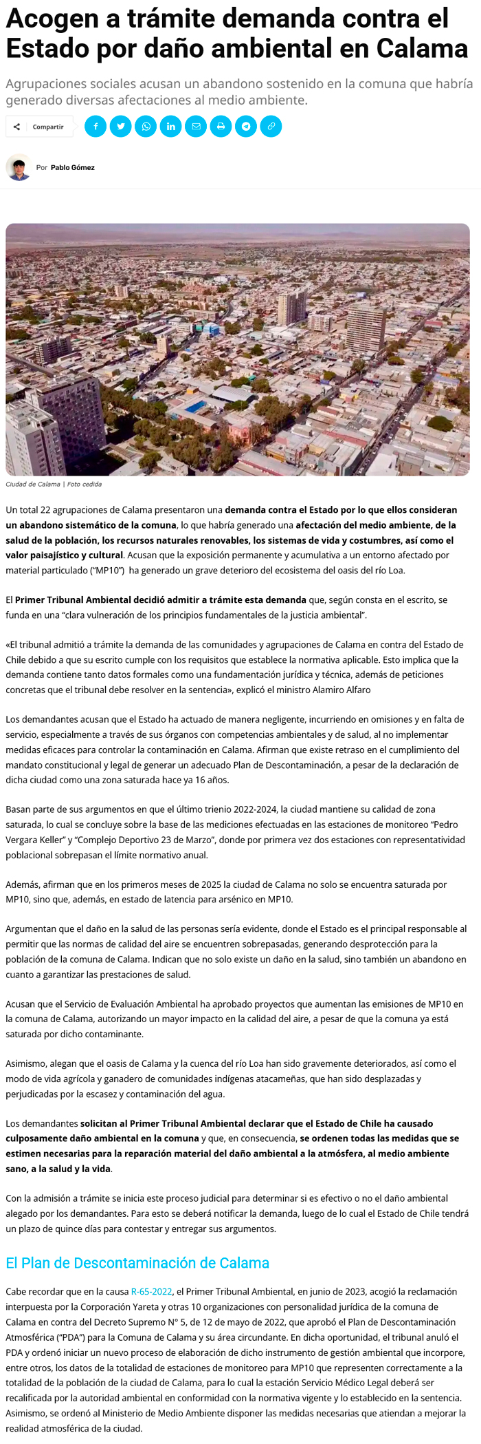 1TA acoge admisibilidad de demanda por daño ambiental en la comuna - (El Mercurio de Calama)
