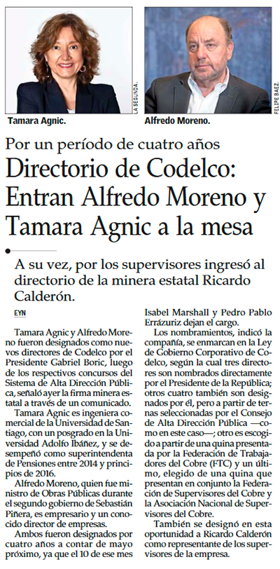 Codelco completa su directorio tras cinco años y renueva dos integrantes con el ingreso de Alfredo Moreno y Tamara Agnic - (Pulso)