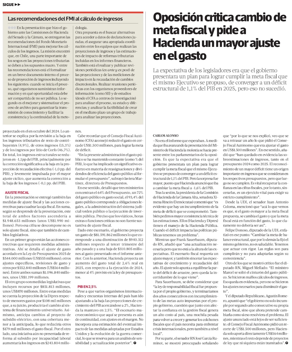 Hacienda incumple de nuevo la regla fiscal y proyecta que próximo gobierno deberá hacer ajustes al gasto - (El Mercurio de Santiago)