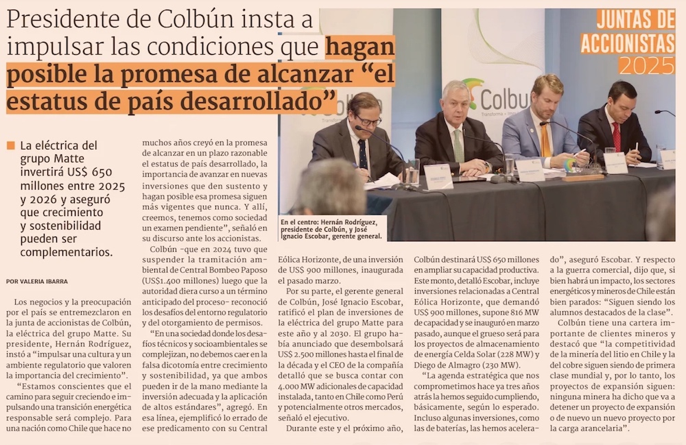Colbún (Matte): “No debemos caer en la falsa dicotomía entre crecimiento y sostenibilidad” - (El Mercurio de Santiago)