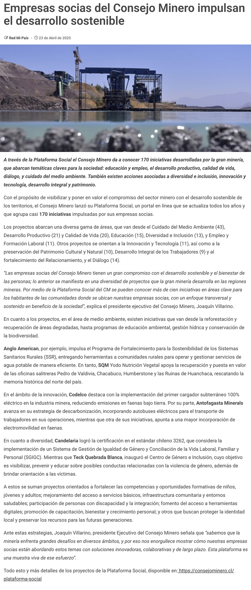 Empresas socias del Consejo Minero impulsan el desarrollo sostenible - (mch.cl)
