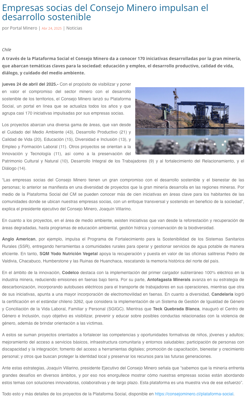 Empresas socias del Consejo Minero impulsan el desarrollo sostenible - (revistacrisol.cl)