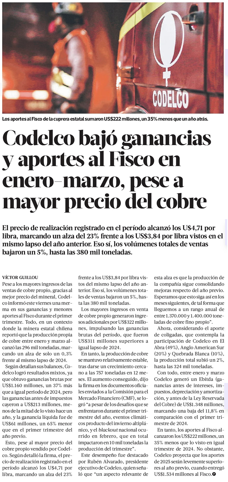 Codelco disminuye en 35% su aporte al fisco - (El Mercurio de Santiago)
