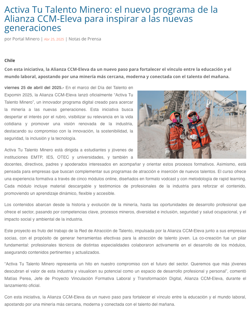 Activa Tu Talento Minero: Nuevo programa de la Alianza CCM-Eleva busca inspirar a las nuevas generaciones - (mch.cl)