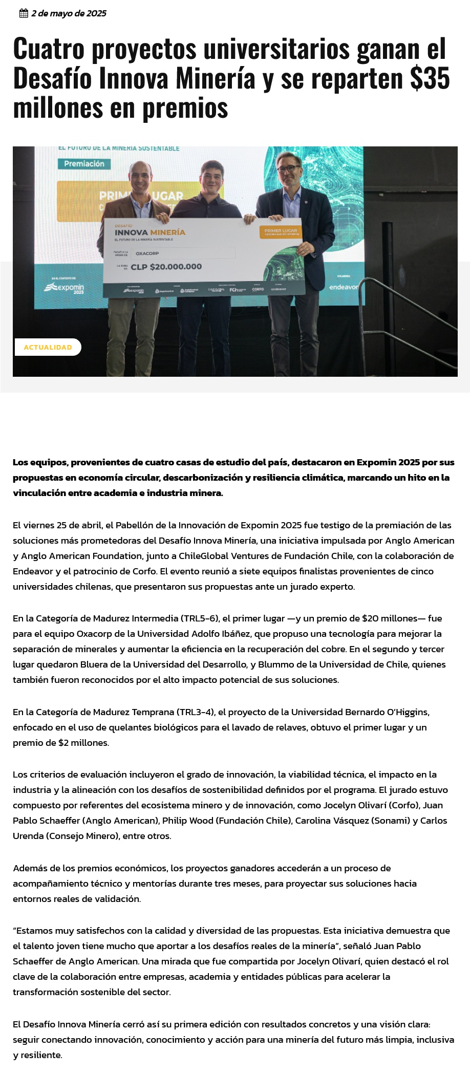 Iniciativas de las universidades Adolfo Ibáñez y Bernardo O`Higgins triunfaron en el desafío Innova Minería de Anglo American - (tierramarillano.cl)