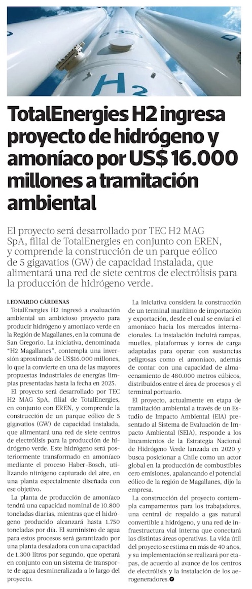 TotalEnergiesH2 presenta mayor proyecto de amoníaco verde - (El Mercurio de Santiago)