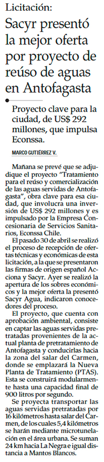 Sacyr y Acciona presentaron ofertas para planta de reúso de aguas en Antofagasta, el mayor proyecto de su tipo en Latinoamérica - (Pulso)