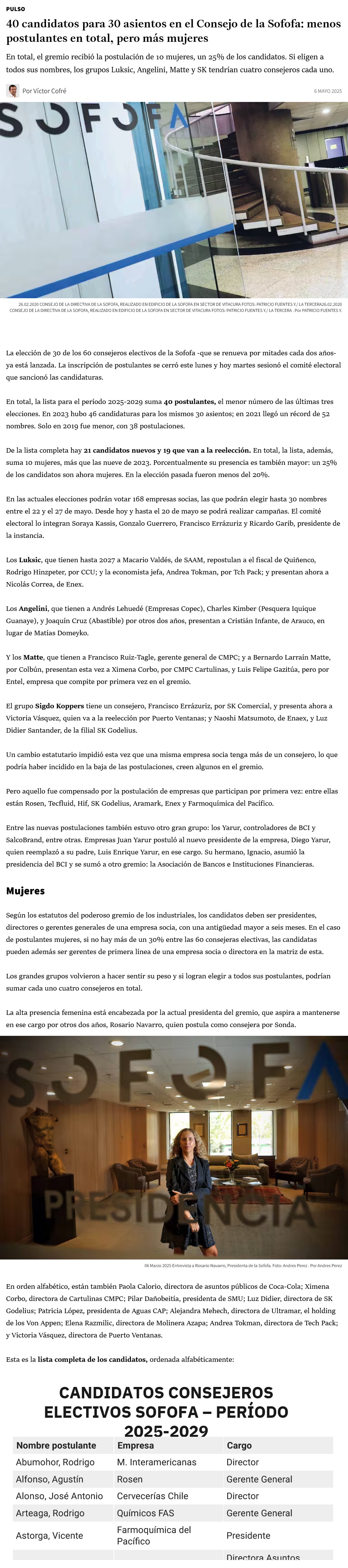 40 candidatos para 30 asientos en el Consejo de la Sofofa: menos postulantes en total, pero más mujeres - (Pulso)