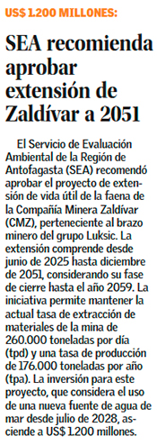 Zaldívar respira: SEA recomienda aprobar proyecto que evita cierre de mina del grupo Luksic - (Diario Financiero)