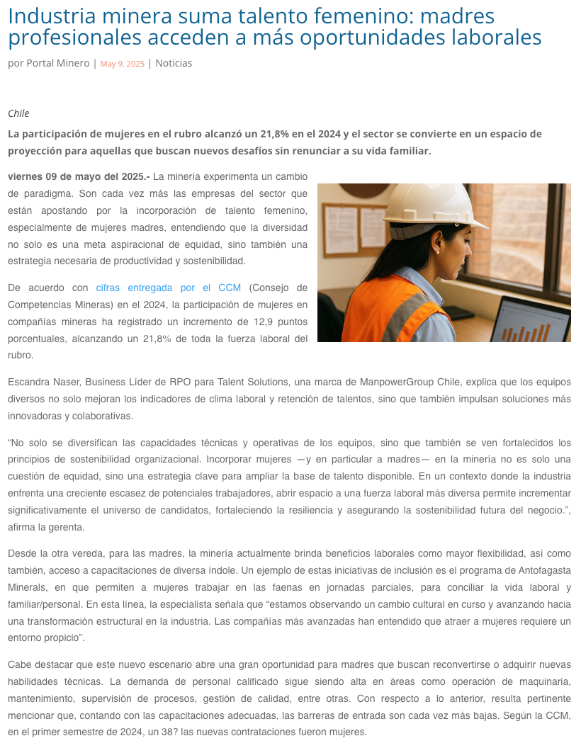 Industria minera suma talento femenino: madres profesionales acceden a más oportunidades laborales - (nuevaminería online)