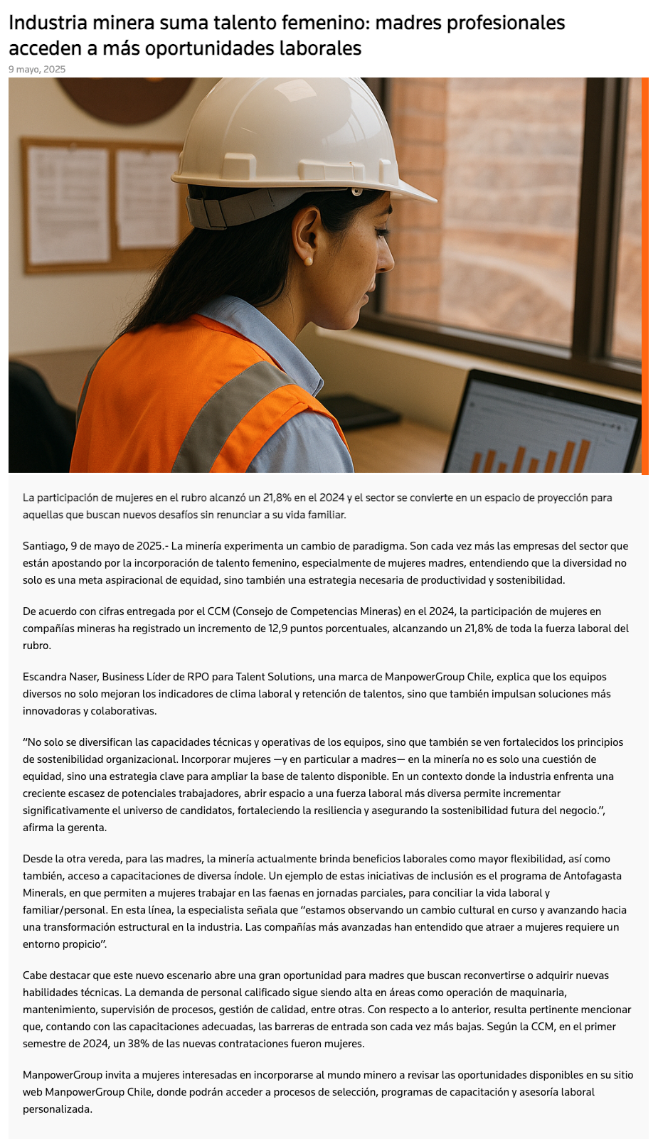 Industria minera suma talento femenino: madres profesionales acceden a más oportunidades laborales - (portalminero)