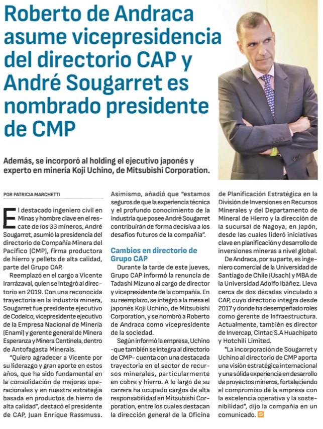 Compañía Minera del Pacífico anuncia a su nuevo presidente - (mch.cl)
