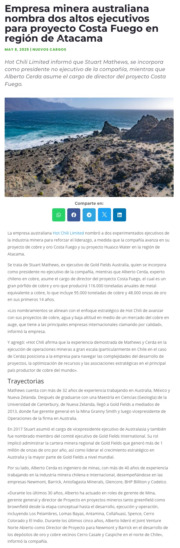Costa Fuego proyecta 5,6 millones de onzas de cobre equivalente y una vida útil de 14 años - (reporteminero)