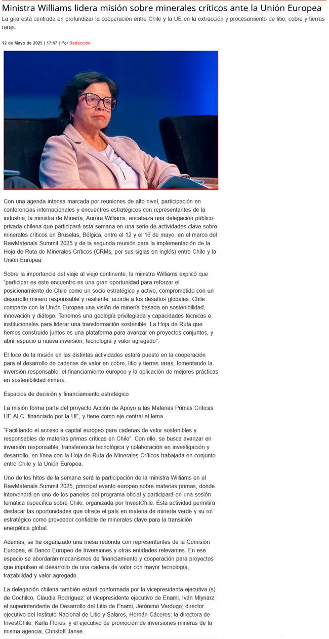 Minerales Críticos: Ministra Aurora Williams encabeza misión en Bruselas para fortalecer alianza estratégica con la Unión Europea - (portalminero)
