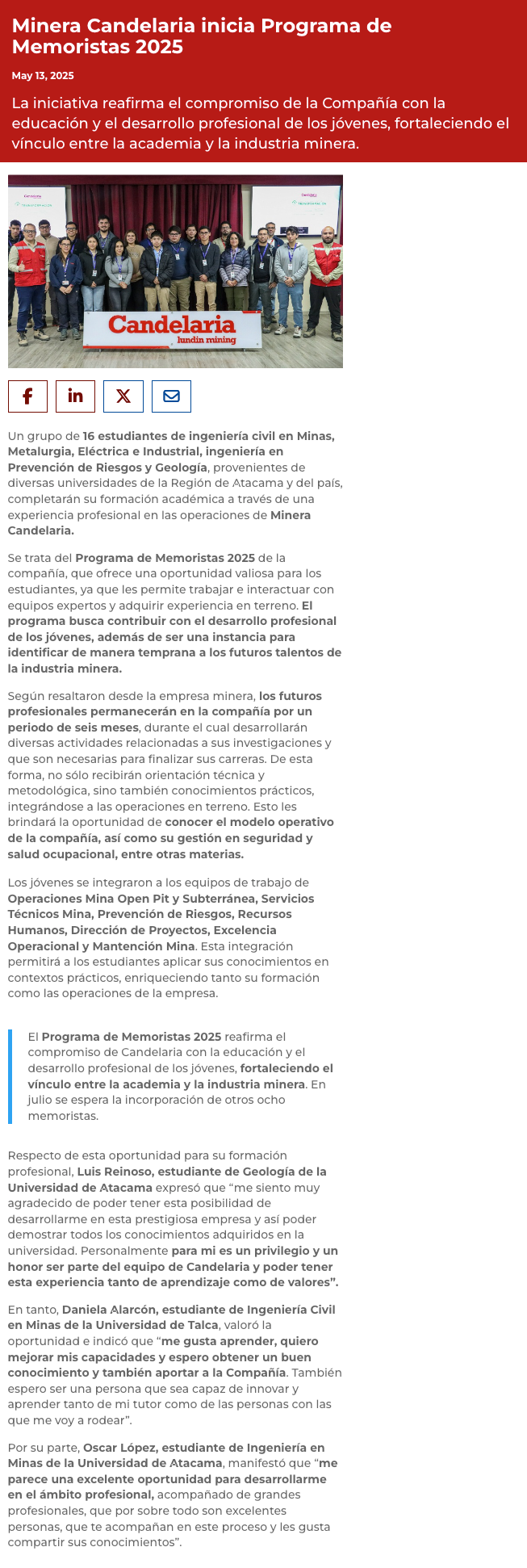 Estudiantes de distintas universidades del país inician experiencia profesional en Minera Candelaria - (madero.cl)