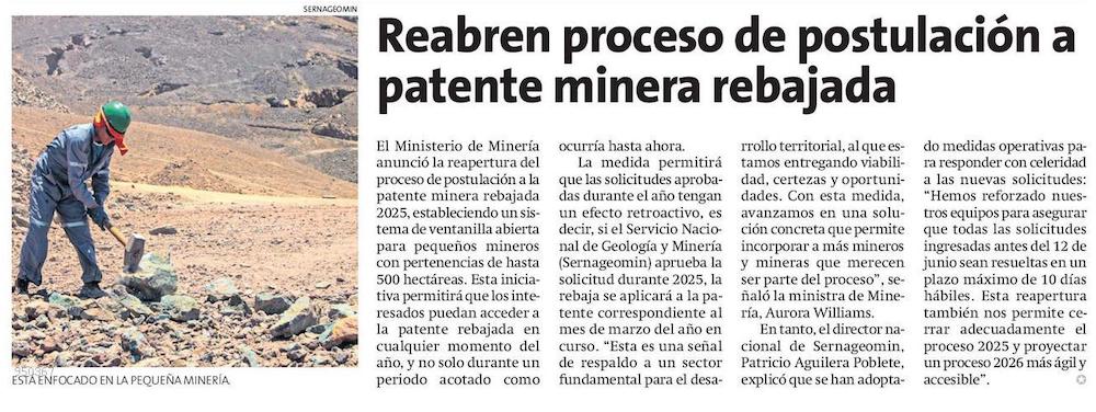 Patente minera rebajada para pequeña minería abre postulaciones - (El Mercurio de Antofagasta)