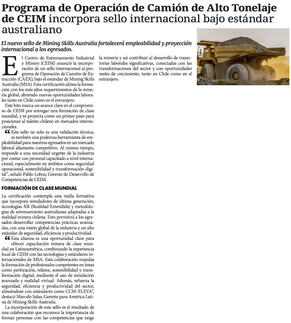 Programa CAEX de CEIM da un salto internacional con certificación Mining Skills Australia - (madero.cl)