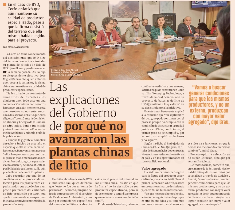 Grau emplaza a BYD a explicitar su “decisión final” tras polémica por proyectos para agregar valor al litio en Chile - (Pulso)