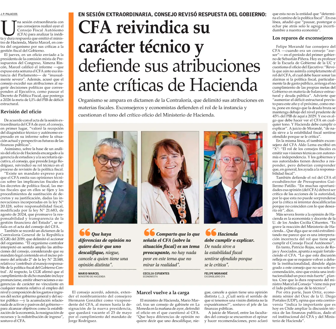 CFA defiende su rol en pugna con el Ministerio de Hacienda y subraya su apego a la ley - (Pulso)