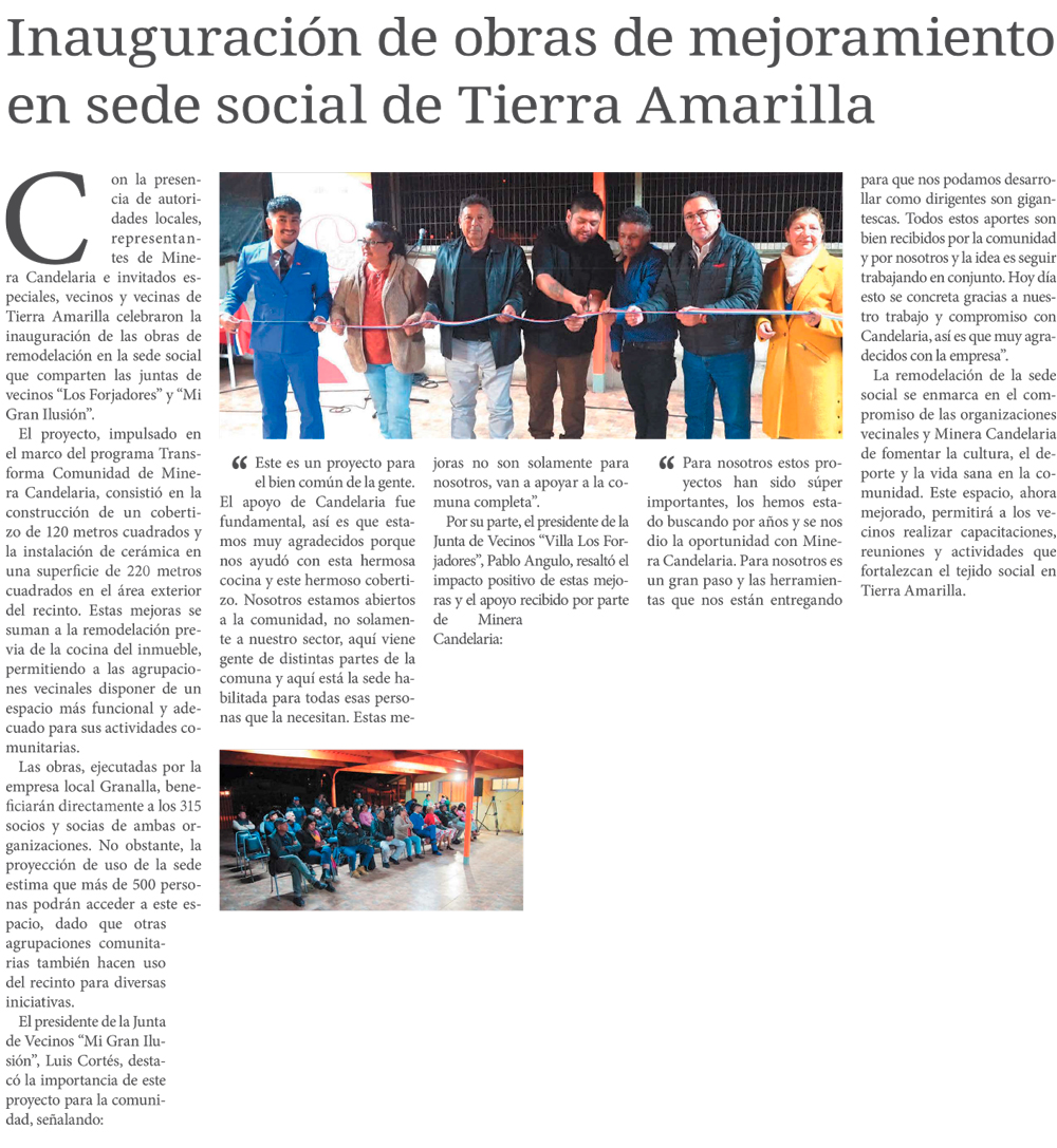 Minera Candelaria apoya a vecinos de Tierra Amarilla en remodelación de sede social - (mch.cl)