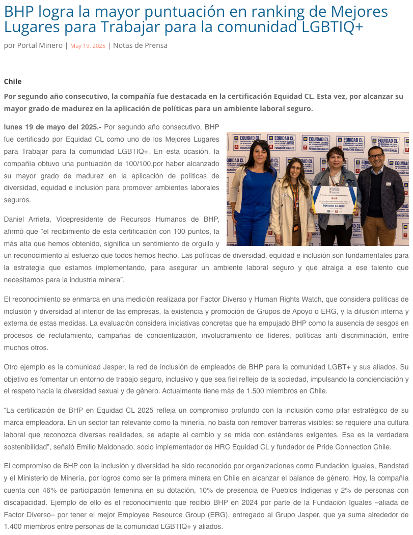 BHP lidera ranking de Mejores Lugares para Trabajar para comunidad LGBTIQ+ - (El Mercurio de Antofagasta)