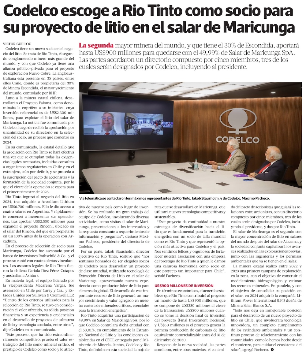 Codelco y Rio Tinto esperan sellar en 2026 acuerdo para producir litio en Maricunga - (El Mercurio de Santiago)