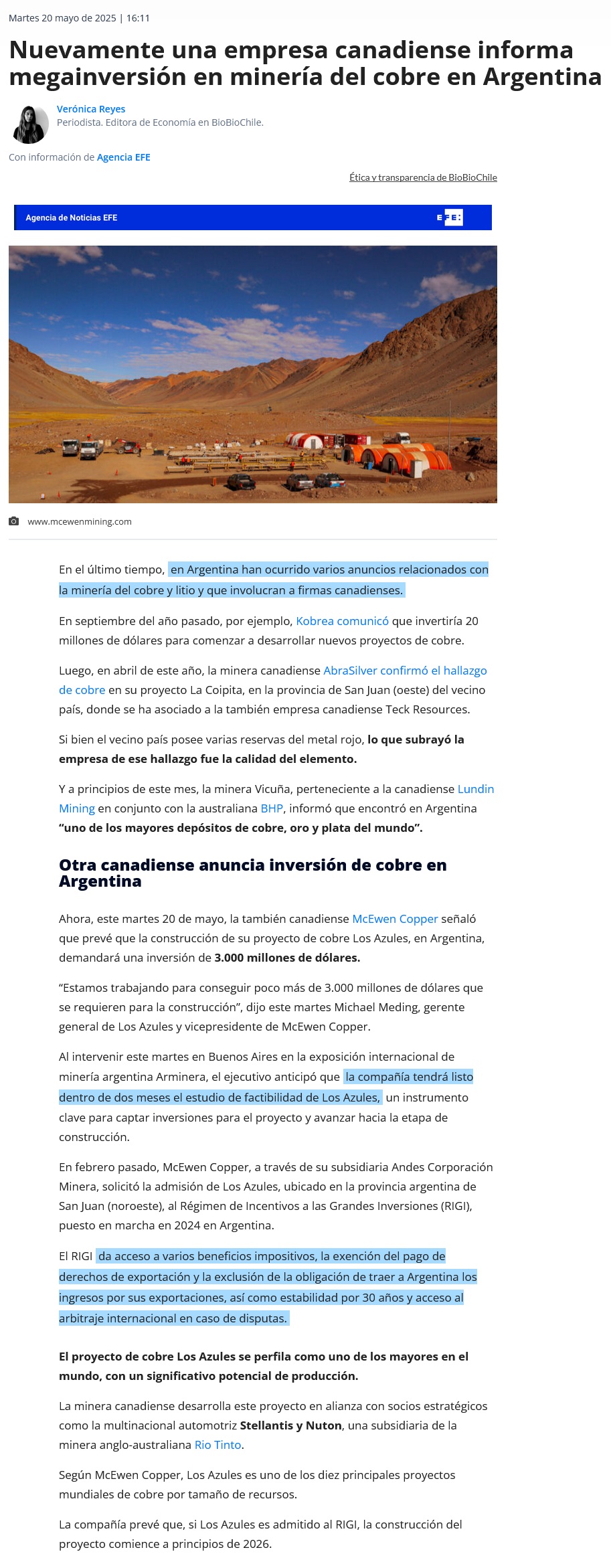 Nuevamente una empresa canadiense informa megainversión en Argentina - (El Pingüino)