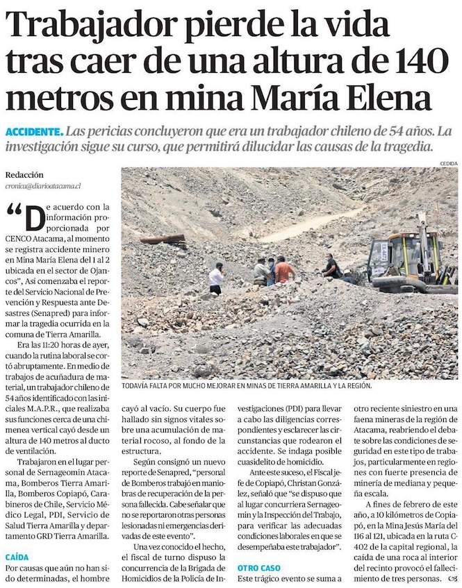 Investigan muerte de trabajador en mina María Elena - (Las Últimas Noticias)