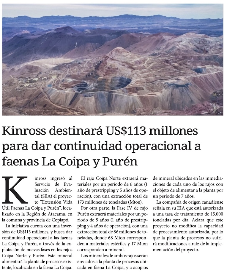 Kinross invertirá US$113 millones en La Coipa y Purén - (El Diario de Atacama)