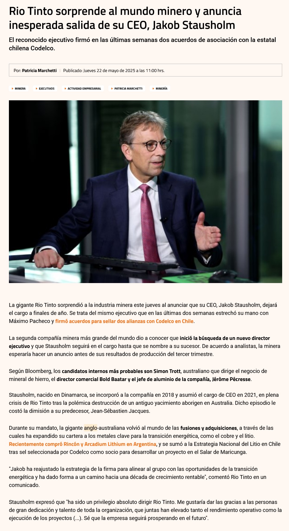 CEO de Rio Tinto dejará este año el cargo - (El Mercurio de Santiago)
