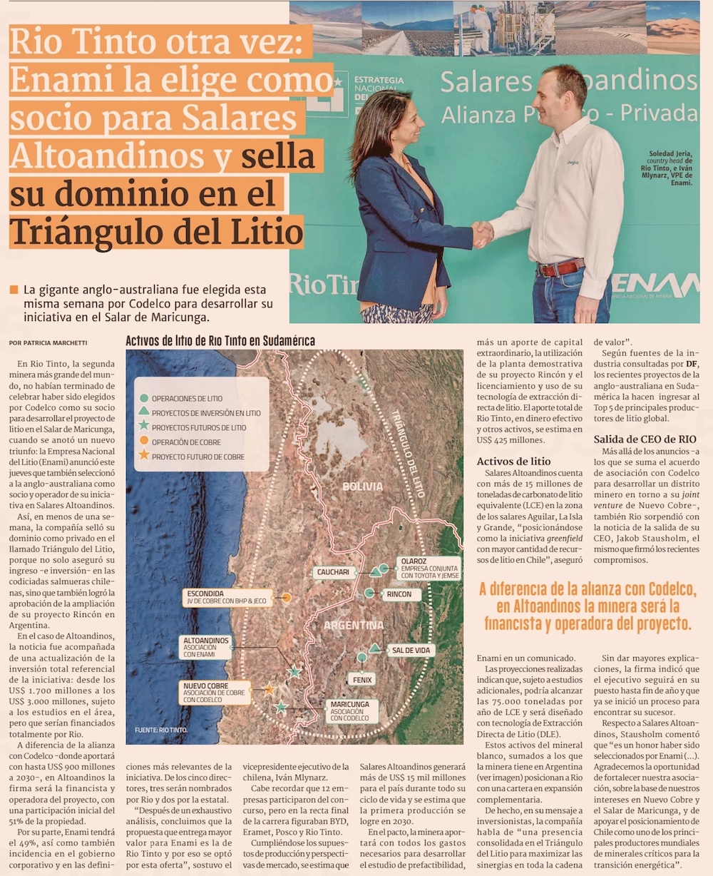 Rio Tinto será el tercer actor privado de litio más grande de Chile tras pactar alianzas con Codelco y Enami - (Pulso)