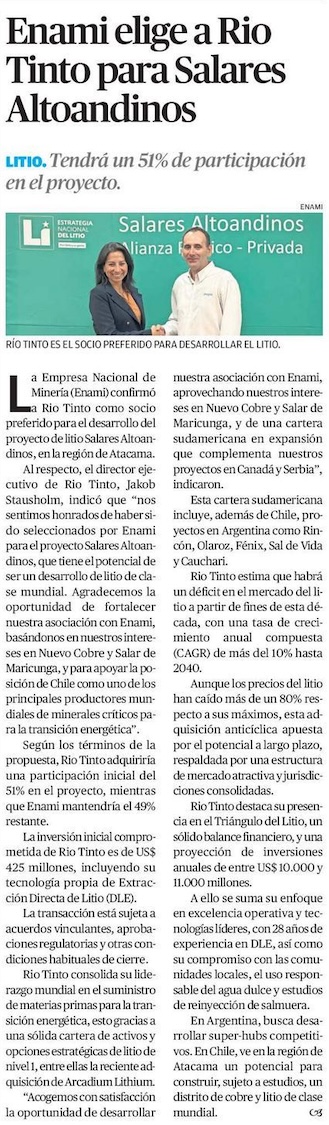 Rio Tinto surge como rival de SQM, tras adjudicarse otro proyecto de litio en Chile - (El Mercurio de Santiago)