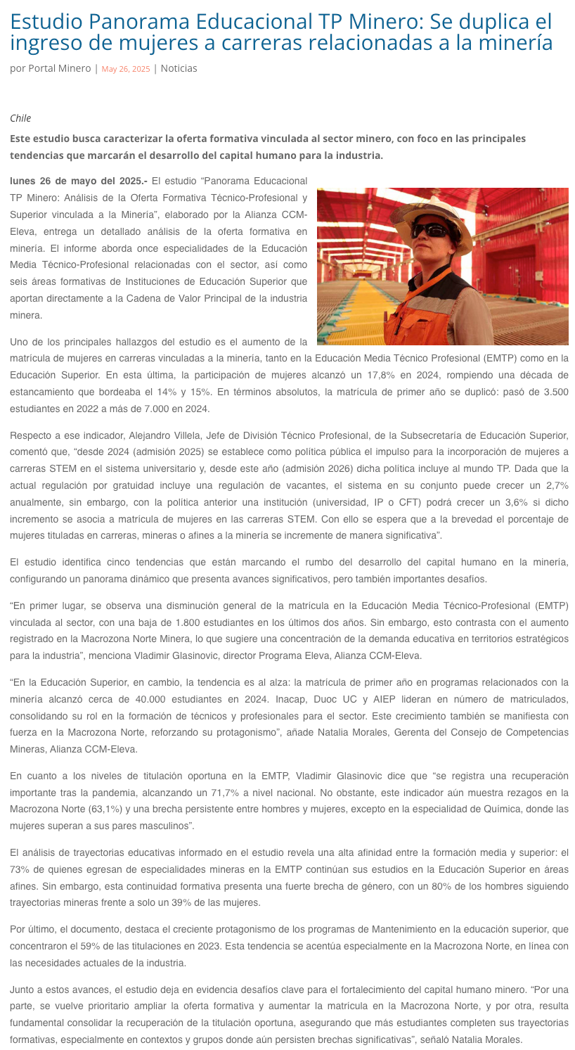 Estudio Panorama Educacional TP Minero: Se duplica el ingreso de mujeres a carreras relacionadas a la minería - (portalinnova.cl)
