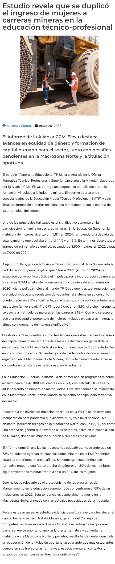 Estudio CCM-Eleva: Se duplica el ingreso de mujeres a carreras relacionadas a la minería - (soychile)
