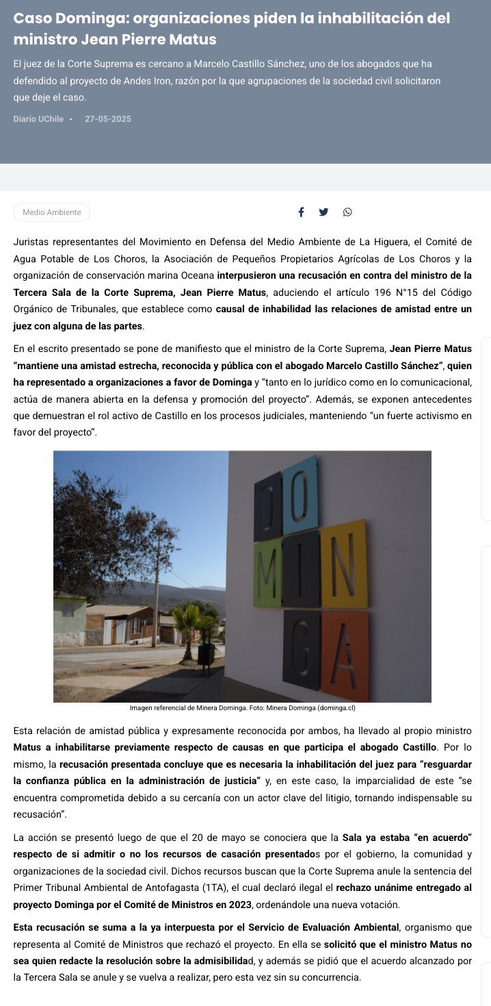Proyecto Dominga: Organizaciones solicitan la inhabilitación del ministro Jean Pierre Matus en la Corte Suprema - (La Región)