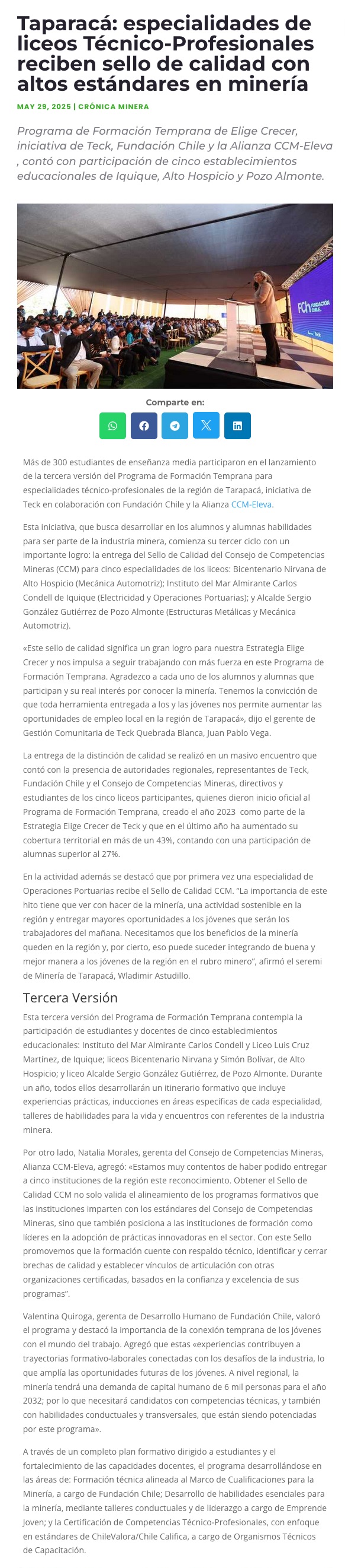 Iniciativa de Teck, Fundación Chile y la Alianza CCM-Eleva: Especialidades de liceos Técnico-Profesionales de la región reciben Sello de Calidad con altos estándares para la minería - (elreporterodeiquique)