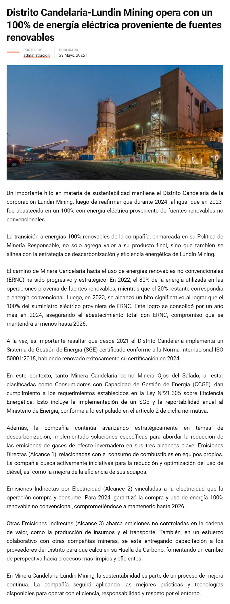 Distrito Candelaria-Lundin Mining opera con un 100% de energía eléctrica proveniente de fuentes renovables - (fmcandelaria.cl)
