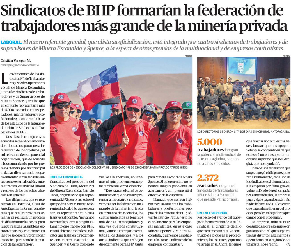 Crece poder sindical del cobre: en BHP buscan crear federación que agrupe operaciones en Chile - (Pulso)