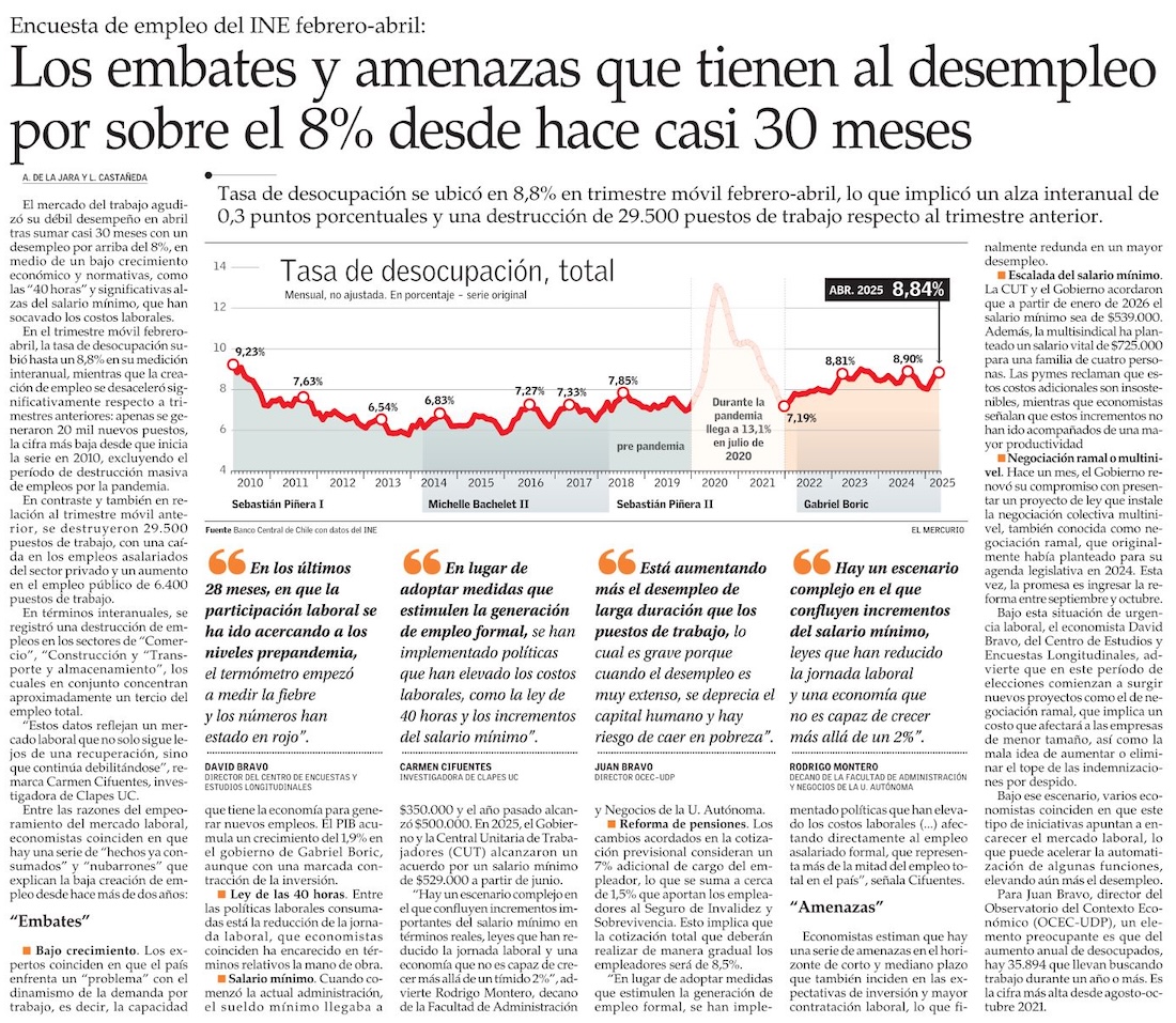 Desempleo sube a 8,8% y desaceleración en la creación de puestos de trabajo prende las alarmas - (Diario Financiero)