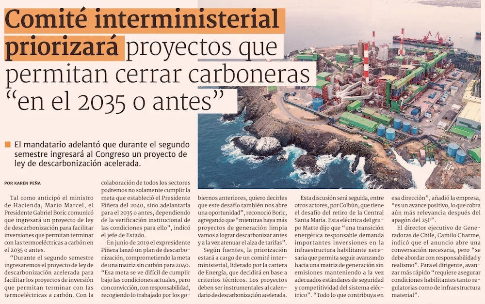 Gobierno anuncia proyecto para acelerar la descarbonización a 2035, pero actores del sector expresan dudas y piden detalles - (La Tercera)